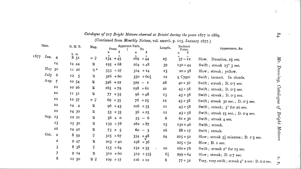 Catalogue of bright meteors observed at Bristol during the years 1877 to 1889 inclusive by W. F. Denning.