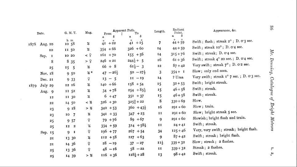 Catalogue of bright meteors observed at Bristol during the years 1877 to 1889 inclusive by W. F. Denning.