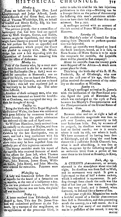 Reports of a meteor, 18th August 1783; from London, Bath, Canterburg, Yorkshire, Salisbury. Plus an account of one in 1738, 29th August.