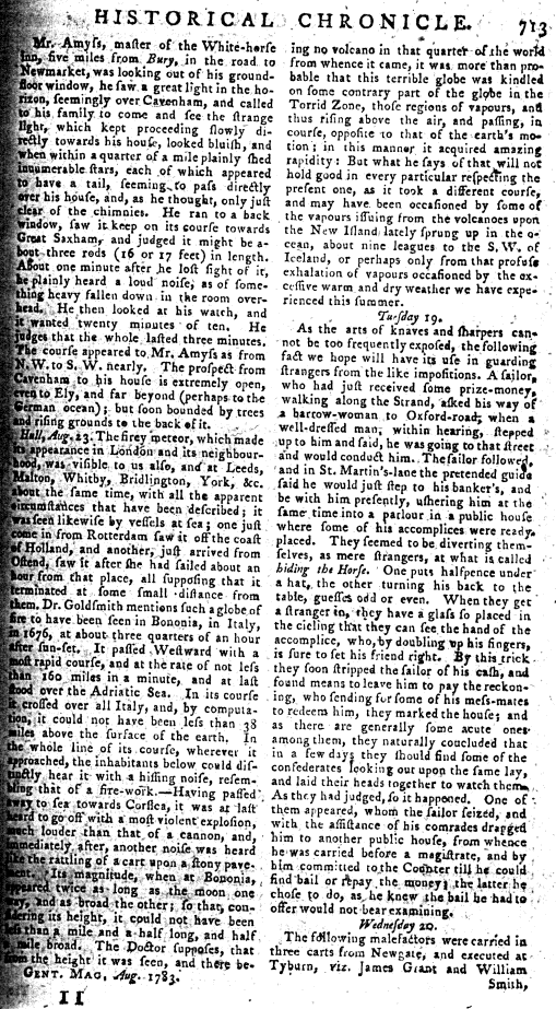 Reports of a meteor, 18th August 1783; from London, Bath, Canterburg, Yorkshire, Salisbury. Plus an account of one in 1738, 29th August.