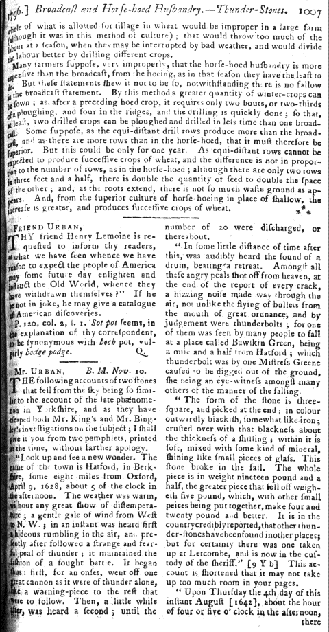 Thunder Stones, Stones falling from the sky. Letter headed B.M. Nov. 10. Printed Dec 1796.