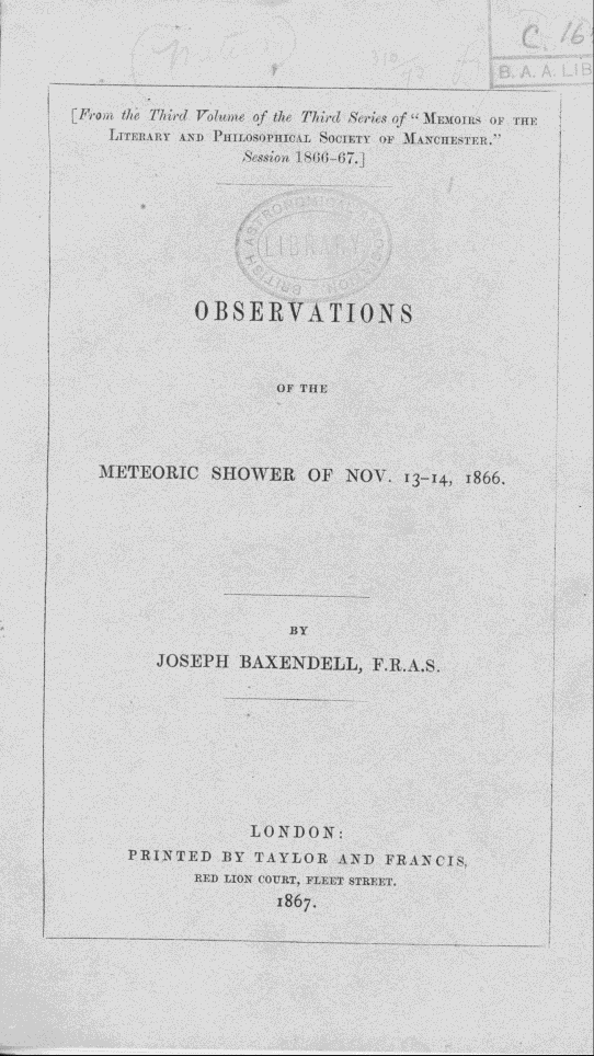 Observations of the Meteoric Shower of Nov. 13-14, 1886 by Joseph Baxendell, F.R.A.S.