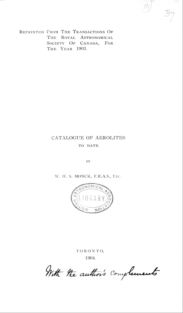 Catalogue of Aerolites to date by W. H. S. Monck, F.R.A.S. (1904)