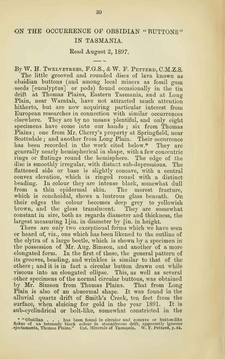 On the occurrence of Obsidian "Buttons" in Tasmania by W. H. Twelvetrees and W. F. Petterd