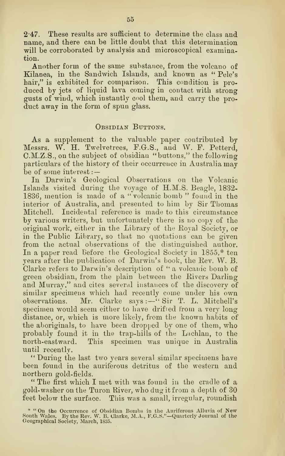 Notes on a specimen of Basalt-glass (Tachylyte) from near Macquarie Plains Tasmania, with remarks on Obsidian "Buttons" by T. Stephens