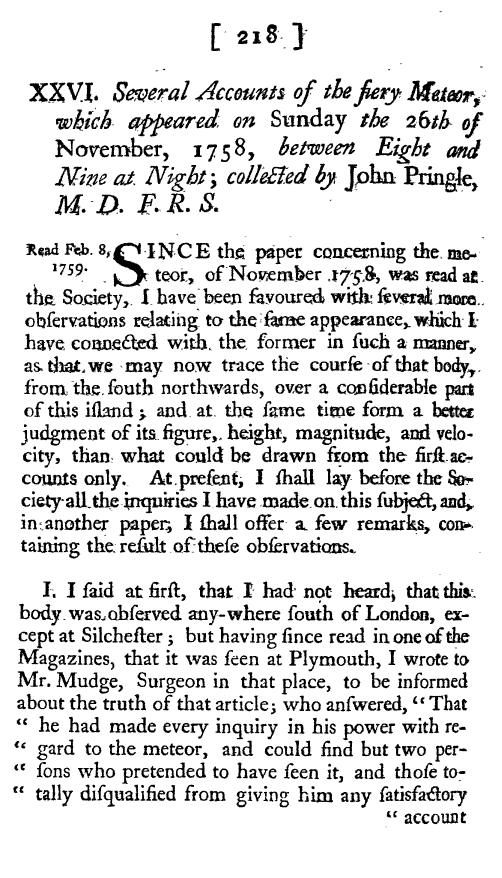 Some Remarks upon the several Accounts of the fiery Meteor (which appeared on Sunday the 26th of November, 1758), and upon other such bodies