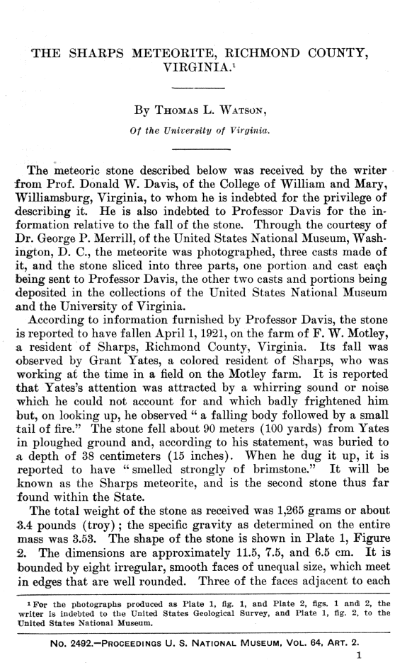 The Sharps meteorite Richmond County, Virginia. By Thomas L. Watson