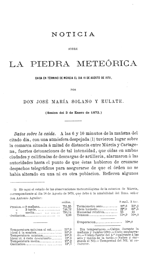 Noticia sobre La Piedra Meteorica caida en termino de murcia el dia 18 de Agosto de 1870.