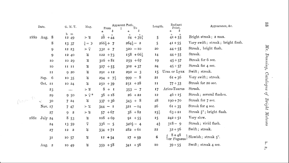 Catalogue of bright meteors observed at Bristol during the years 1877 to 1889 inclusive by W. F. Denning.