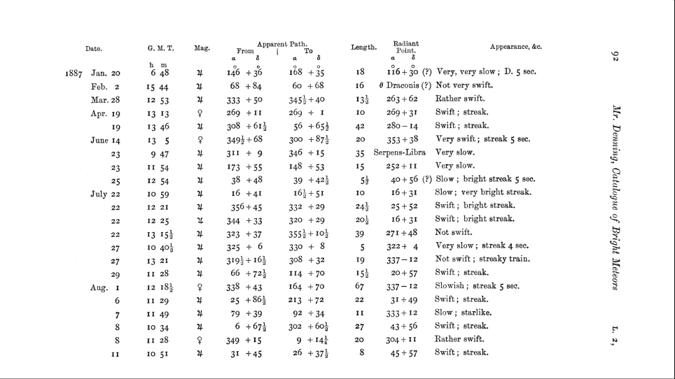 Catalogue of bright meteors observed at Bristol during the years 1877 to 1889 inclusive by W. F. Denning.