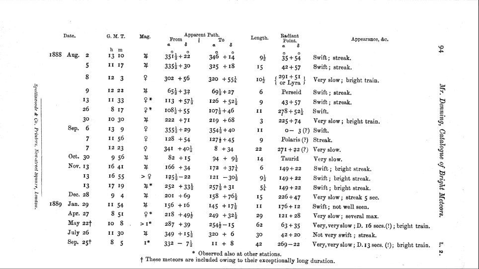Catalogue of bright meteors observed at Bristol during the years 1877 to 1889 inclusive by W. F. Denning.