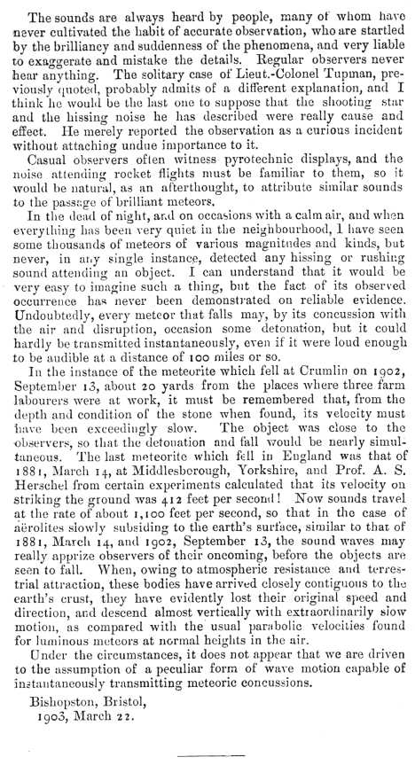 On the Sounds alleged to Precede or Accompany the Flights of Meteors, by W. F. Denning.
