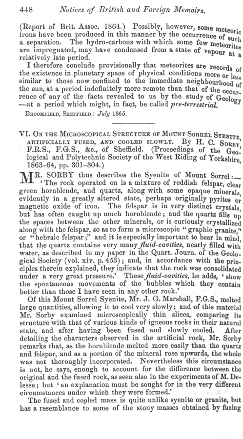 On the physical history of meteorites by H. C. Sorby