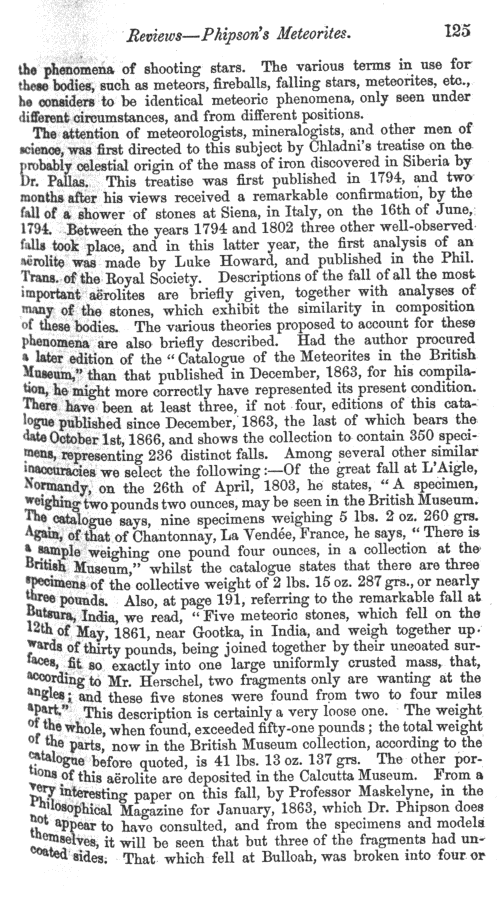 Review of --Meteorites, Aerolites, and falling stars by T. L. Phipson--