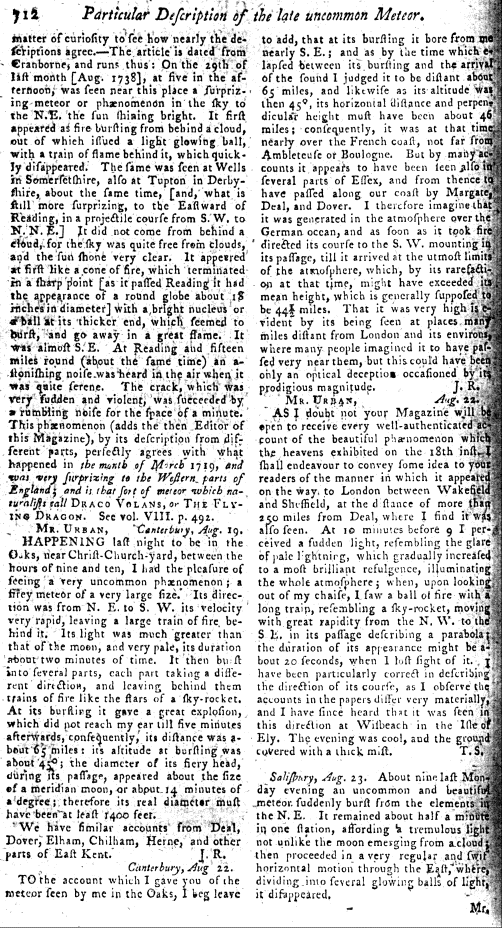 Reports of a meteor, 18th August 1783; from London, Bath, Canterburg, Yorkshire, Salisbury. Plus an account of one in 1738, 29th August.