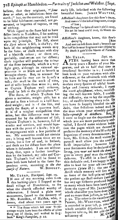 Stones fallen from the Air a Natural Phaenomenon, by W. Bingley. from The Gentleman's Magazine