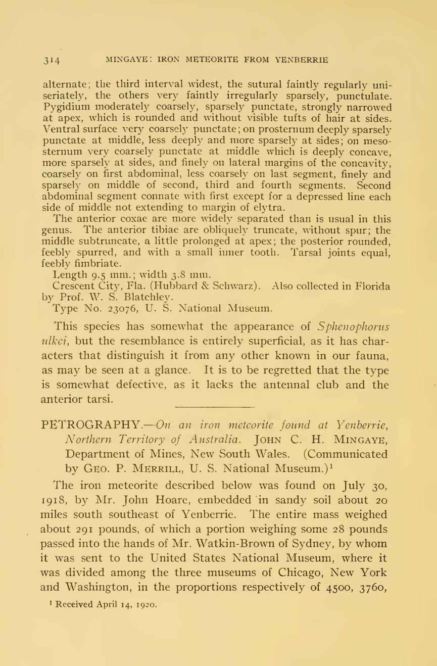 On an iron meteorite found at Yenberrie, Northern Territory of Australia by John C. H. Mingaye