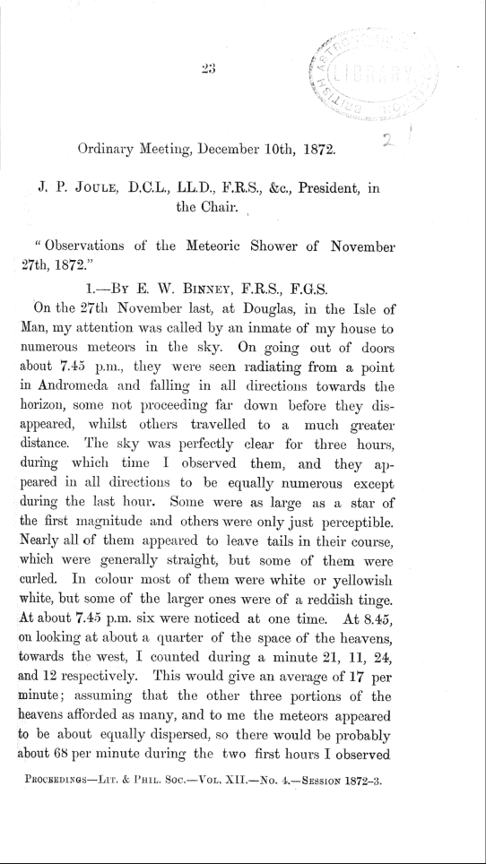 Observations of the Meteoric Shower of November 27th, 1872 by E.W. Binney, F.R.S., F.G.S.