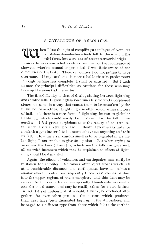 Catalogue of Aerolites to date by W. H. S. Monck, F.R.A.S. (1904)