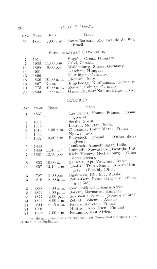 Catalogue of Aerolites to date by W. H. S. Monck, F.R.A.S. (1904)