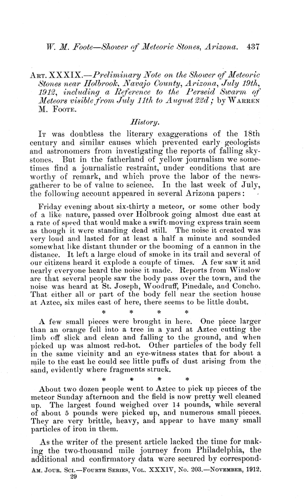 Preliminary note on the shower of meteoric stones at Aztec, near Holbrook, Navajo County, Arizona. by W. M. Foote
