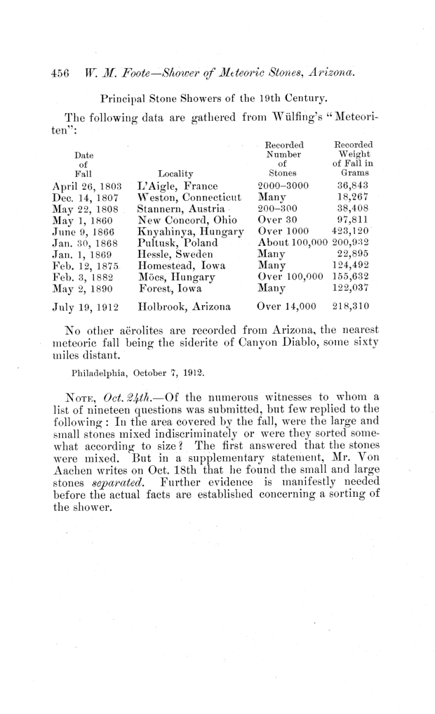 Preliminary note on the shower of meteoric stones at Aztec, near Holbrook, Navajo County, Arizona. by W. M. Foote