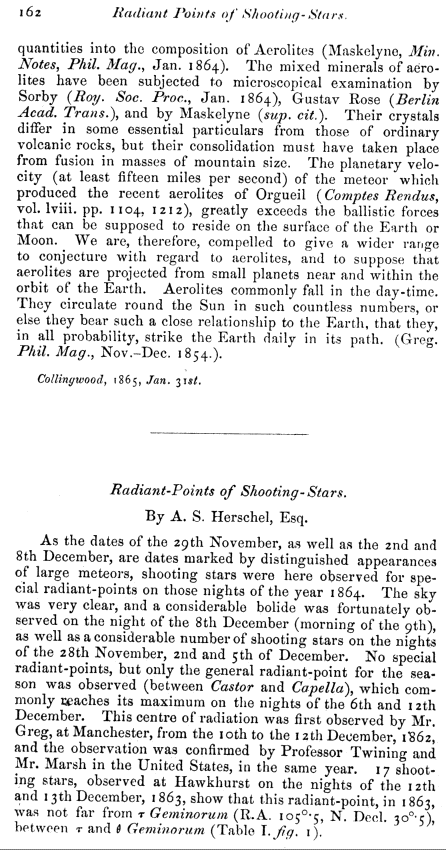 Progress of Meteoric Astronomy during the Year 1863-4, by A. S. Herschel, Esq.