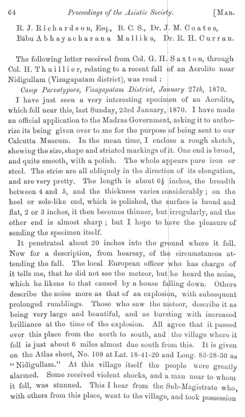 Letter from Col. G. H. Saxton relating to a recent fall of an aerolite near Nidigullam.