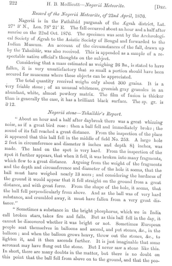 Record of the Judesegeri meteorite of 16th Feburary, 1876.