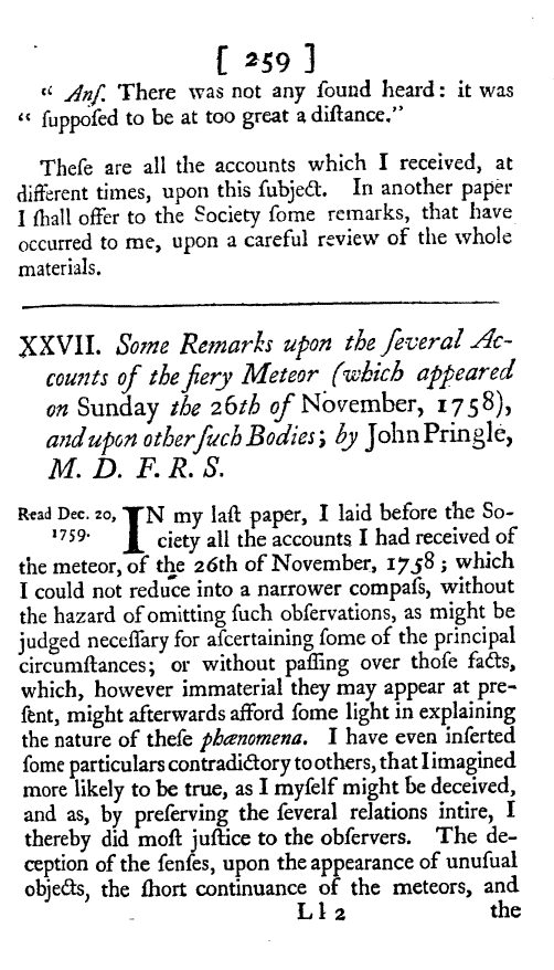 Some Remarks upon the several Accounts of the fiery Meteor (which appeared on Sunday the 26th of November, 1758), and upon other such bodies