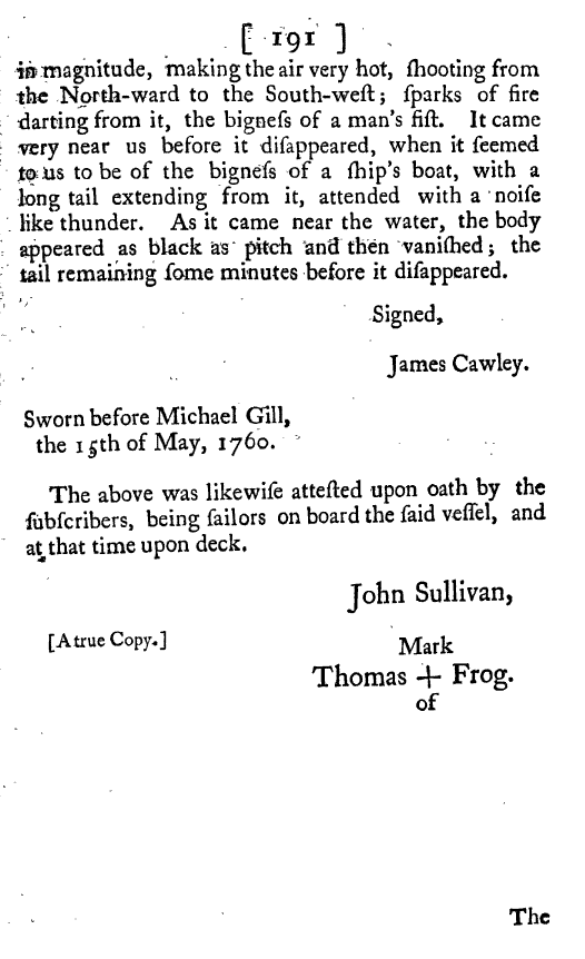 An Account of several fiery Meteors seen in North America. From Volume 54 of the Philosophical Transactions of the Royal Society (1764)