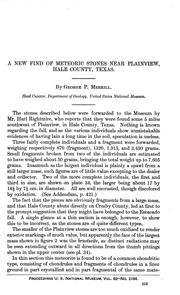 A new find of meteoric stones near Plainview, Hale County, Texas. by George P. Merrill