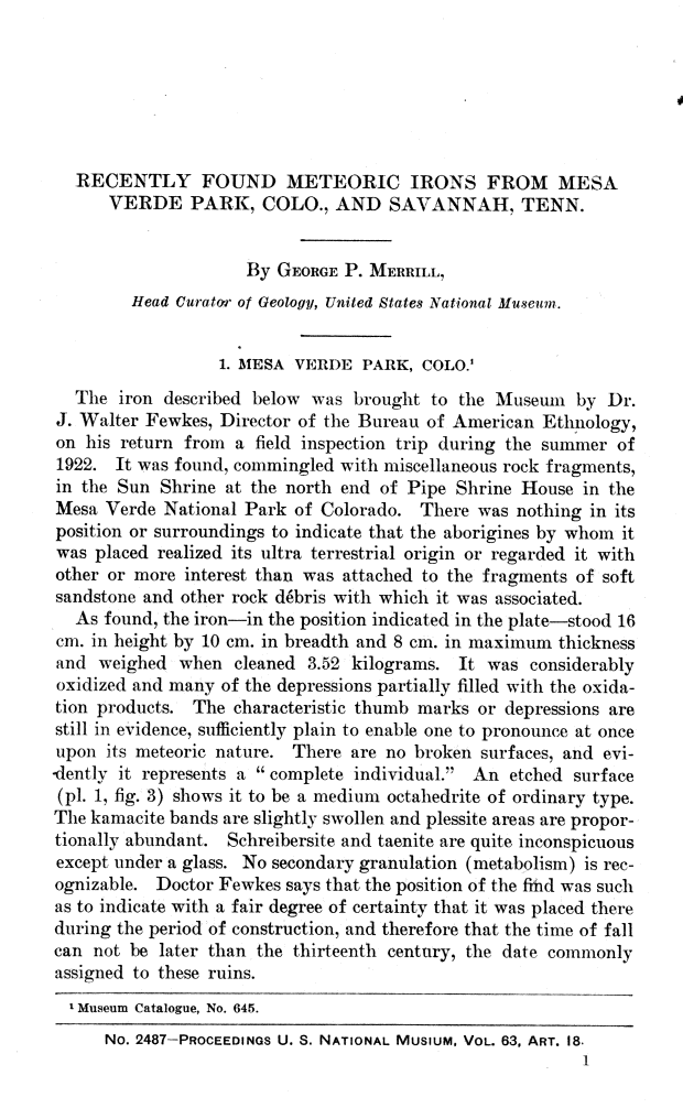 Recently found meteoric irons from Mesa Verde Park, Colo., and Savannah, Tenn. by George P. Merrill