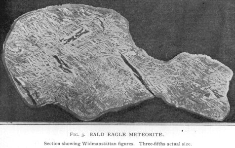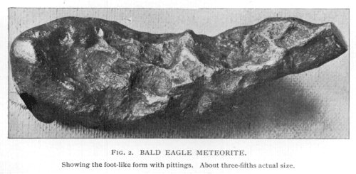 "It was in one of these depressions, several hundred feet from the railroad track, that on or about Sept. 25, 1891, some Italians, while getting out stones for a stone-crusher, found in a bed of loose stones, about two meters deep, something which resembled a stone in appearance. It was covered with a fungus growth, as were the stones, but when picked up attracted the laborer's attention on account of its weight. He showed it to the Superintendent who tried to break it, and failing attempted to cut it with a cold chisel, when it proved to be soft iron. When several weeks later the owner of the crusher, Mr. George S. Matlock, came to the works it was given to him, and he, realizing its value, presented it to this university. It weighs 3.3 Kilos. (7 lbs. 1 oz.) In shape it resembles in general outline, a human foot. (Fig. 2, plate VIII.) The flat face, corresponding to the sole, measures 16.6 cm. (6 1/2 inches) long, and 8 cm. (3 1/8 inches) wide at the broadest place. From the extremity of the heel it projects upward 14 cm. (5 1/2 inches), ending in a point. The surface is covered with a reddish brown iron rust. This easily scales off in many places, and at several points this covering is so thin that the bright metal shines through. It is pitted quite deeply in some places, and very irregular in outline. * * * * * Its specific gravity is 7.06. It is quite soft compared with ordinary wrought iron. Chemical analysis gave Fe 91.36; Ni 7.56; Co. 0.70; PO .09; SO .06; Si. trace,= 99.77.It has seemed to be desirable to add to this description by Prof. Owens a view of this most interesting iron. The picture (Fig. 2, plate VIII) is a half-tone taken from a photograph of the mass before cutting. Its resemblance to a human foot is very striking, despite the many rough notches and depressions which cover the surface. But few of these depressions are well defined pittings, seeming rather to be fractuosites, caused by the violent tearing of the iron from a parent mass, and the sharpness of the angles and crests reduced by the attrition to which the whole mass has been subjected. A portion only of the surface, all the upper part of the ankle, has a well smoothed surface, with a fine granulation akin to a skin or crust. On the back, above the heel, are two sharp depressions, one round and 3/8 of an inch in depth and in diameter, the other, half as deep, a paralellogram 3/4 of an inch long and 1/3 inch wide. Both of these have vertical walls, and show clearly as cavities which have once been filled with softer matter, probably troilite nodules, which have since been eroded or decomposed away. On the top of the front part of the foot is a deep cavity, due to the folds in the iron, which passes nearly through to the sole. The sole itself is very flat, which has allowed a thin slice, 1/4 of an inch thick and weighing 300 grammes, to be cut off, of same width from toe to heel, and like thickness throughout, like the sole of a shoe. The polished section is quickly etched by the use of dilute nitric acid, and the Widmanstatten figures produced are both sharp and peculiar. (Fig. 3, plate VIII.) The iron is typically octahedral. The etched surface is composed mainly of short kamacite blades, with an average thickness of about 1 mm. and from 5 to 10 mm. in length. These depart from the ordinary rule defining the usual angular figures by being largely curved or snake-like in form, giving a pattern like that of floss or tangled yarn. Many of these kamacite blades are club-shaped (rounded on both ends) as in the Augusta Co., Va., iron. The patches of plessite are minute, sometimes showing clearly the alternate layers of taenite and kamacite. The taenite plates lying between the kamacite blades are very narrow, but stand out in prominent relief on the etched surface, and are faintly distinguishable by their bronze yellow color from the tin-white kamacite.Nothing is known as to the time of its fall, though as it was found covered by several feet of stones which have not been moved sensibly since the Susquehanna valley has been inhabited by white men, it could not have been recent. As far as can be learned, this is the only specimen of the fall which has been found."