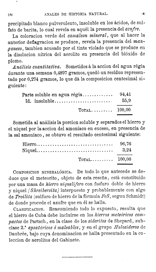 Noticia sobre un Hierro Meteorico hallado en el departamento oriental de la isla de Cuba