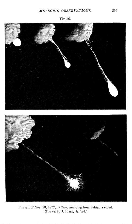 The fireball of Nov. 23, 1877, gave a sound like salvoes of artillery, and doors and windows were shaken violently. At Chester the noise of of its explosion was compared to loud but distant thunder.